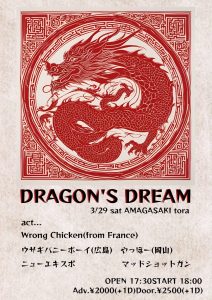 2025 3/29sat[DRAGON’S DREEM] 2025.03.292025.03.31 act… Wrong Chicken(from France) ウサギバニーボーイ(広島) やっほー(岡山) ニューエキスポ マッドショットガン OPEN 17:30 START 18:00 Adv.¥2000(+1D) Door.¥2500(+1D)