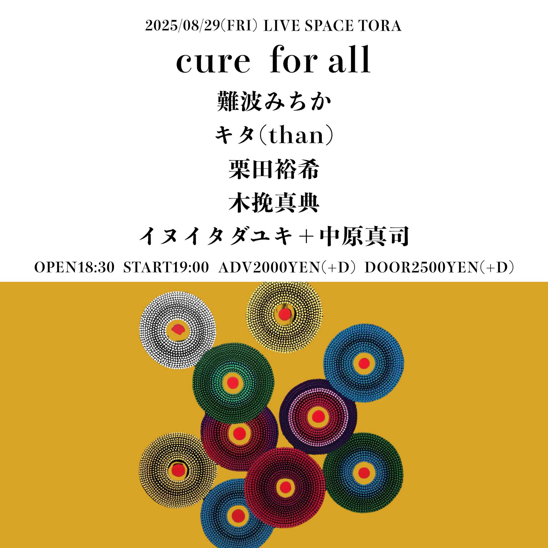 2025 8/29fri[cure of all] 2025.08.29 act… 難波みちか キタ(than) 栗田裕希 木挽真典 イヌイタダユキ+中原真司 OPEN 18:30 START 19:00 Adv.¥2000(+1D) Door.¥2500(+1D)