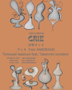 2025 10/5sun[CRIE] 2025.10.05 act… 少年タイチ アニキ from ANIKI BAND 岩村トモユキ+takemoto tomohiro and more … OPEN 13:00 START 13:30 Adv.¥2000(+1D) Door.¥2500(+1D)