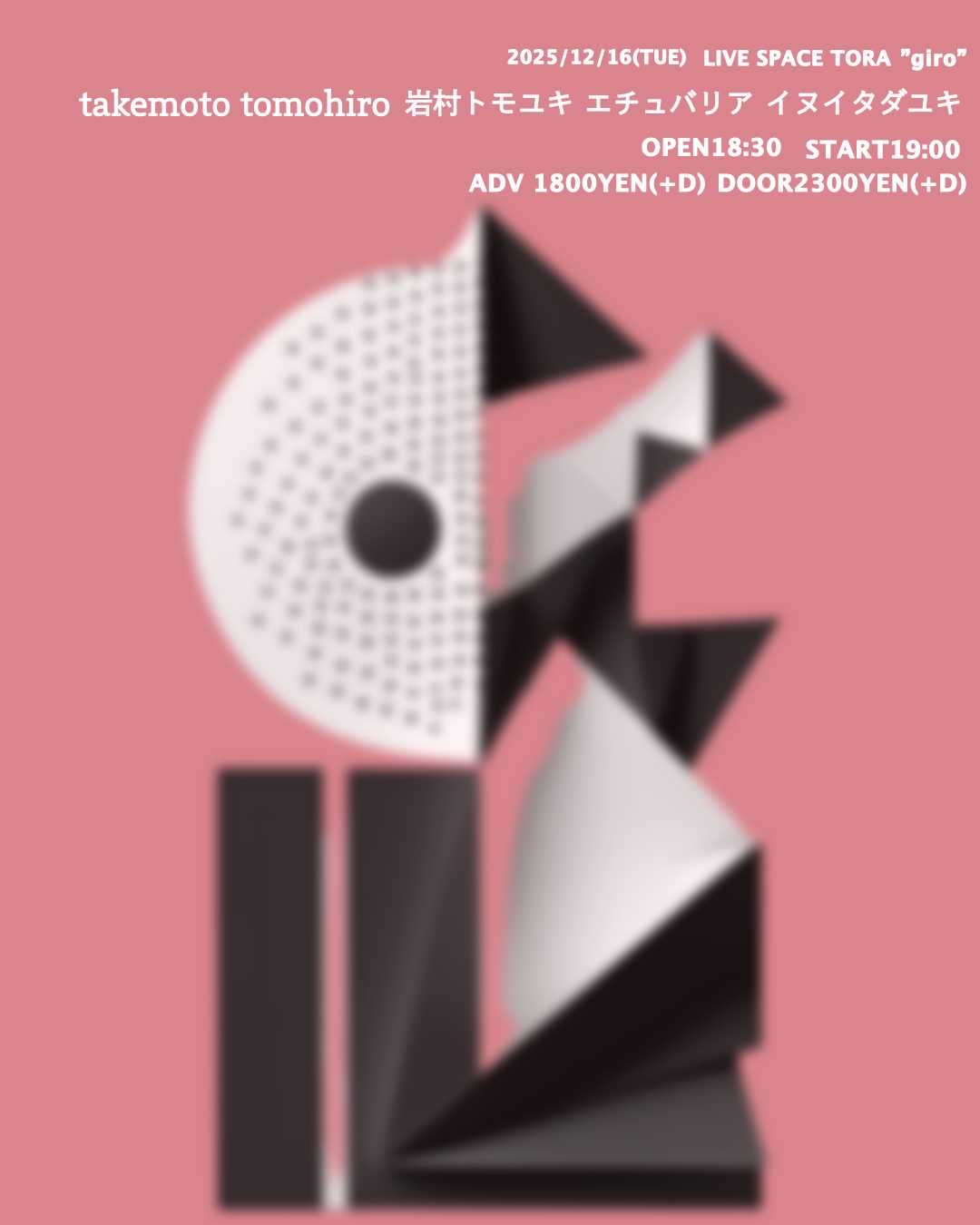 2025 12/16tue[giro] 2025.12.16 act… tomohiro takemoto 岩村トモユキ エチュバリア イヌイタダユキ and more … OPEN 18:30 START 19:00 Adv.¥1800(+1D) Door.¥2300(+1D)