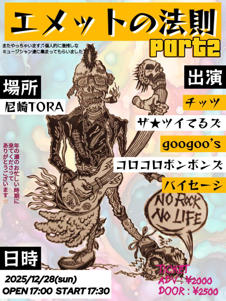 2025 12/28sun[エメットの法則2] 2025.12.28 act… チッツ googoos ザ⭐︎ツイてるズ バイセーシ コロコロボンボンズ OPEN 17:00 START 17:30 Adv.¥2000(+1D) Door.¥2500(+1D)