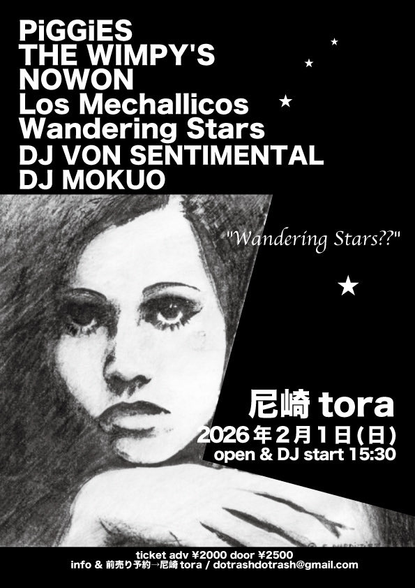 2026 2/1sun[”Wandering Stars??”] 2026.02.01 act… PiGGiES THE WIMPY’S NOWON Los Mechallicos Wandering Stars DJ VON SENTIMENTAL DJ MOKUO OPEN 15:30 START 15:30 Adv.¥2000(+1D) Door.¥2500(+1D)