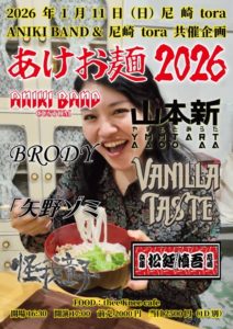 2026 1/11sun[ANIKI BAND 共催企画 「あけお麺2026」] 2026.01.11 act… ANIKI BAND CUSTOM BRODY VANILLA TASTE 怪我童子 松延慎吾 山本新 FOOD: theeKnee Cafe 開場16:30 開演17:00 前売2000円 当日2500円(1D別)