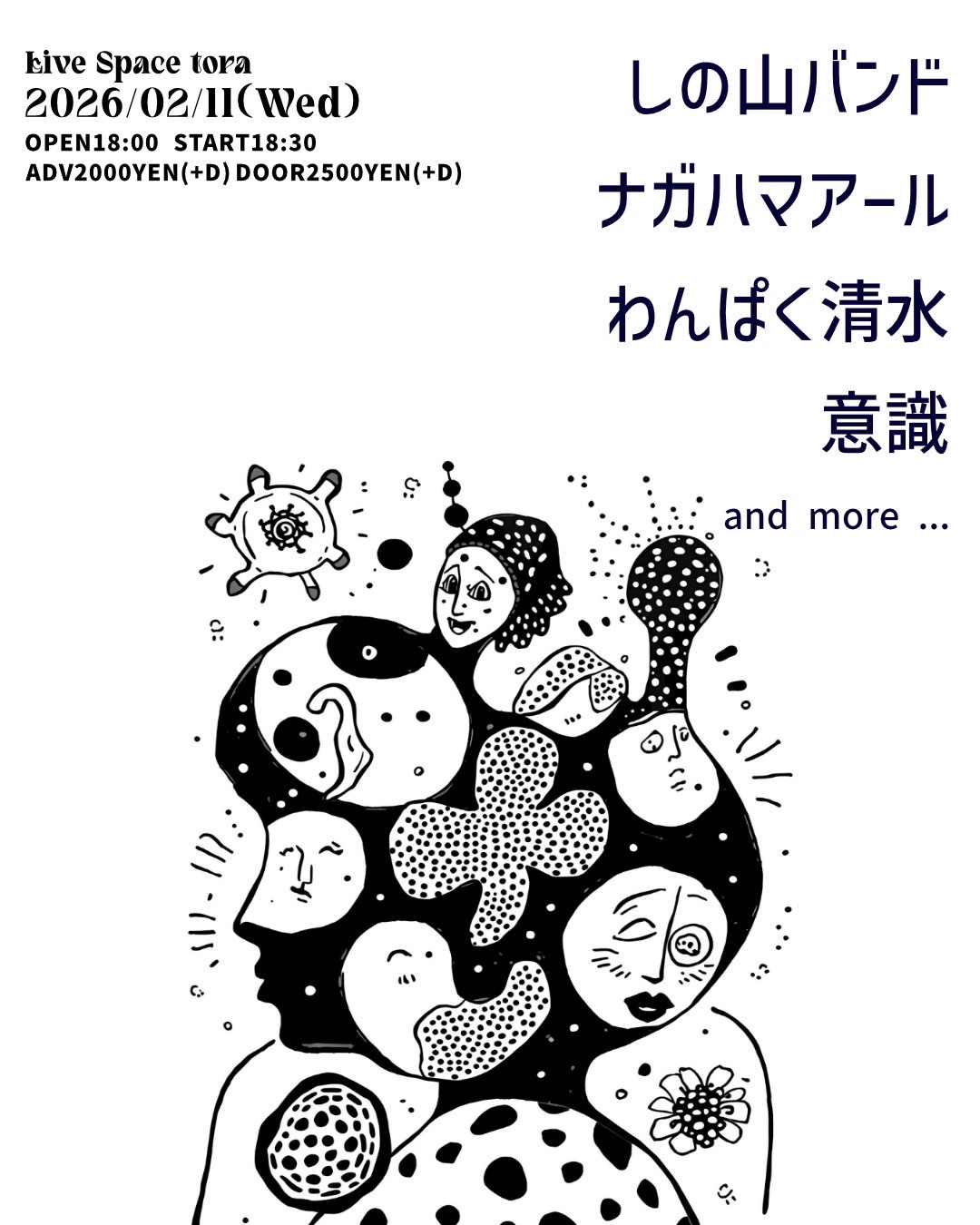 2026 2/11wed[NO TITLE] 2026.02.11 act… しの山バンド ナガハマアール わんぱく清水 意識 and more … OPEN 18:00 START 18:30 Adv.¥2000+1D) Door.¥2500(+1D)
