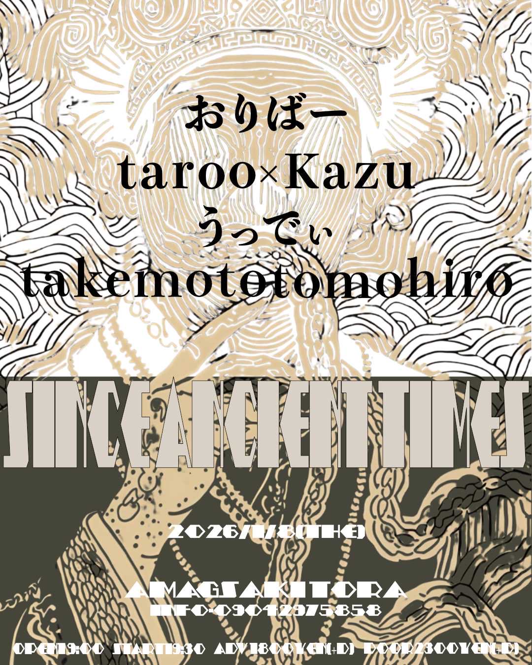 2026 1/8thu[Since ancient times] 2026.01.08 act… おりばー taroo x Kazu おりばー×taroo×うっでぃ× takemoto tomohiro OPEN 19:00 START 19:30 Adv.¥1800(+1D) Door.¥2300(+1D)