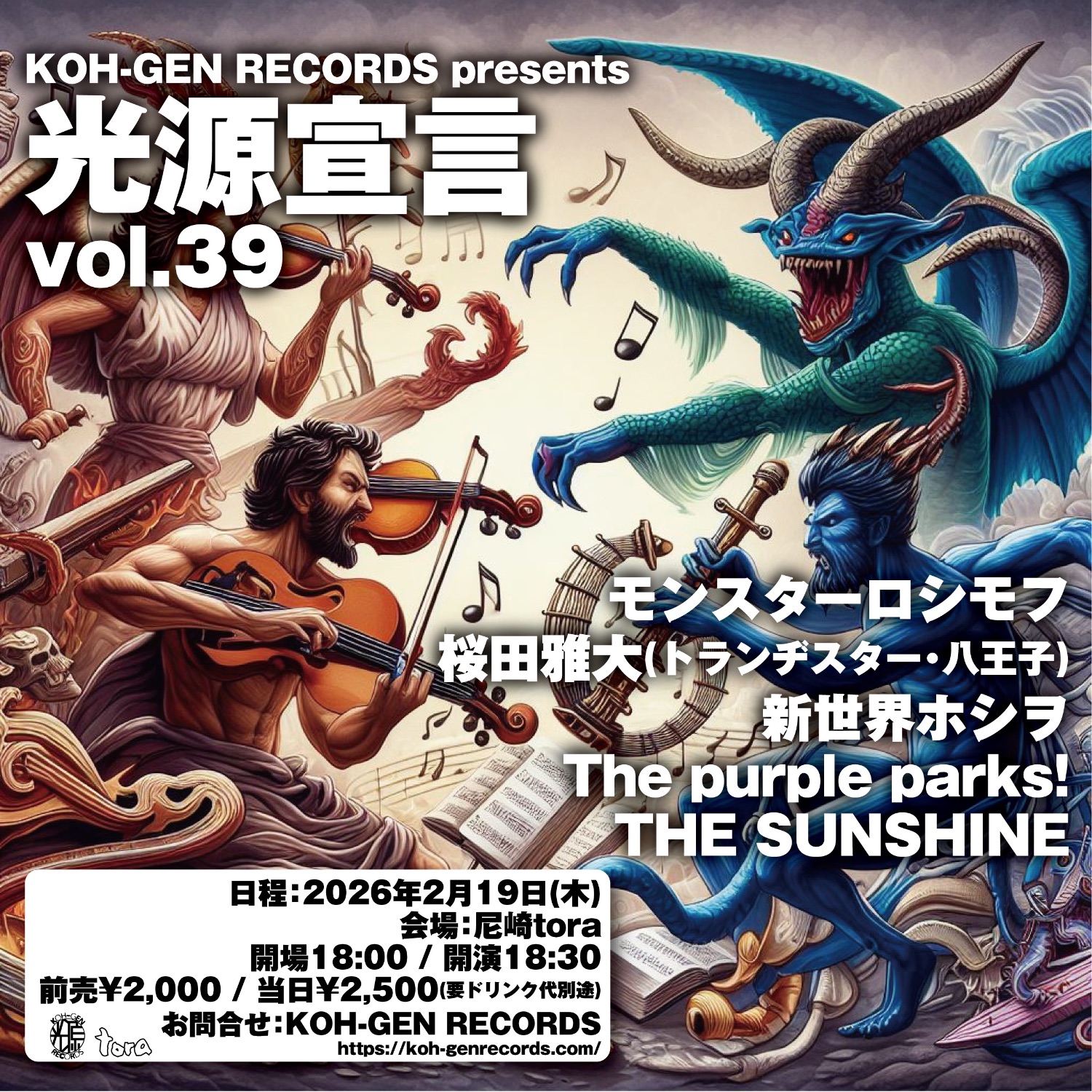 2026 2/19thu[KOH-GEN RECORDS presents『光源宣言 vol.39』] 2026.02.19 act… モンスターロシモフ 桜田雅大(トランヂスター・八王子) 新世界ホシヲ The purple parks! THE SUNSHINE OPEN 18:00 START 18:30 Adv.¥2000(+1D) Door.¥2500(+1D)