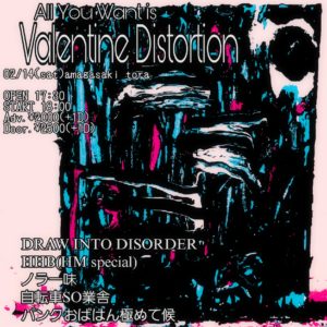2026 2/14sat[All You Want is “Valentine Distortion”] 2026.02.14 act… DRAW INTO DISORDER HHB(HM special) ノラ一味 自転車SO業舎 パンクおばはん極めて候 OPEN 17:30 START 18:00 Adv.¥2000(+1D) Door.¥2500(+1D)