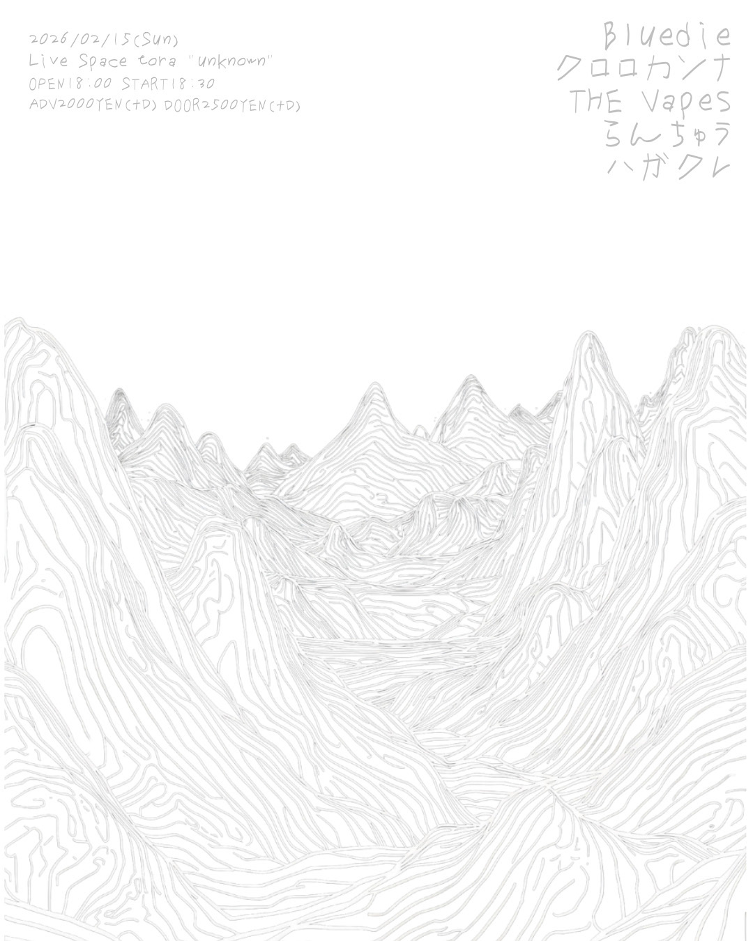 2026 2/15sun[unknown] 2026.02.15 act… Bluedie クロロカンナ The Vapes(東京) らんちゅう ハガクレ(名古屋) OPEN 18:00 START 18:30 Adv.¥2000(+1D) Door.¥2500(+1D)