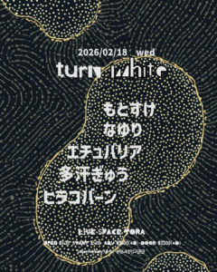 2026 2/18wed[turn white] 2026.02.18 act… もとすけ なゆり エチュバリア 多汗ぎゅう ヒラコバーン OPEN 18:30 START 19:00 Adv.¥1800(+1D) Door.¥2300(+1D)