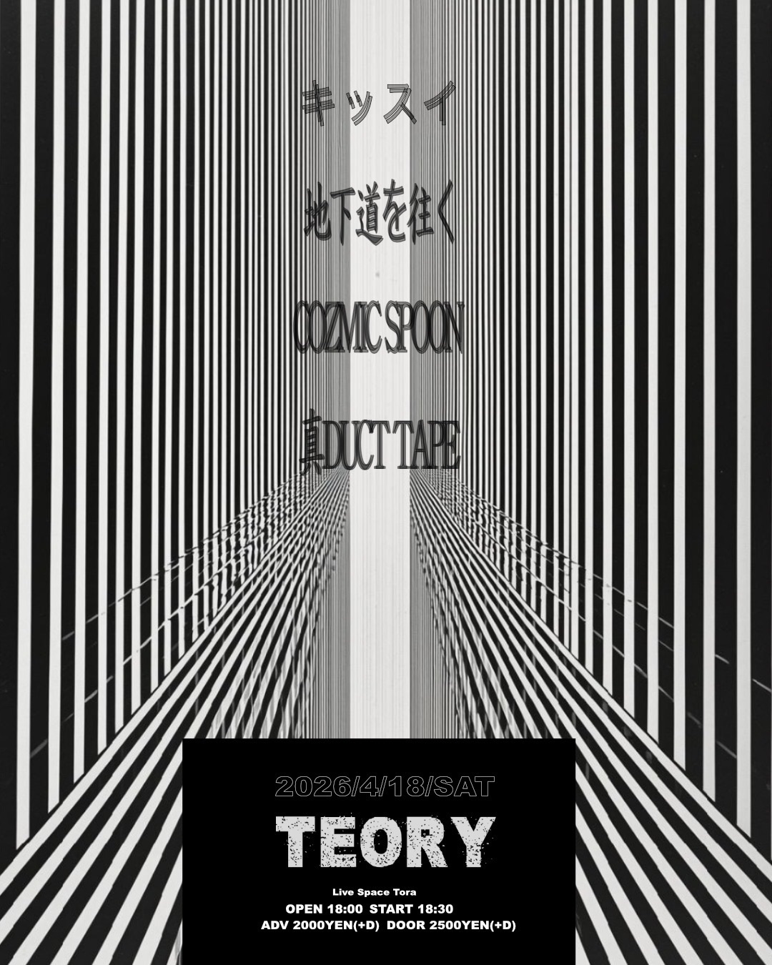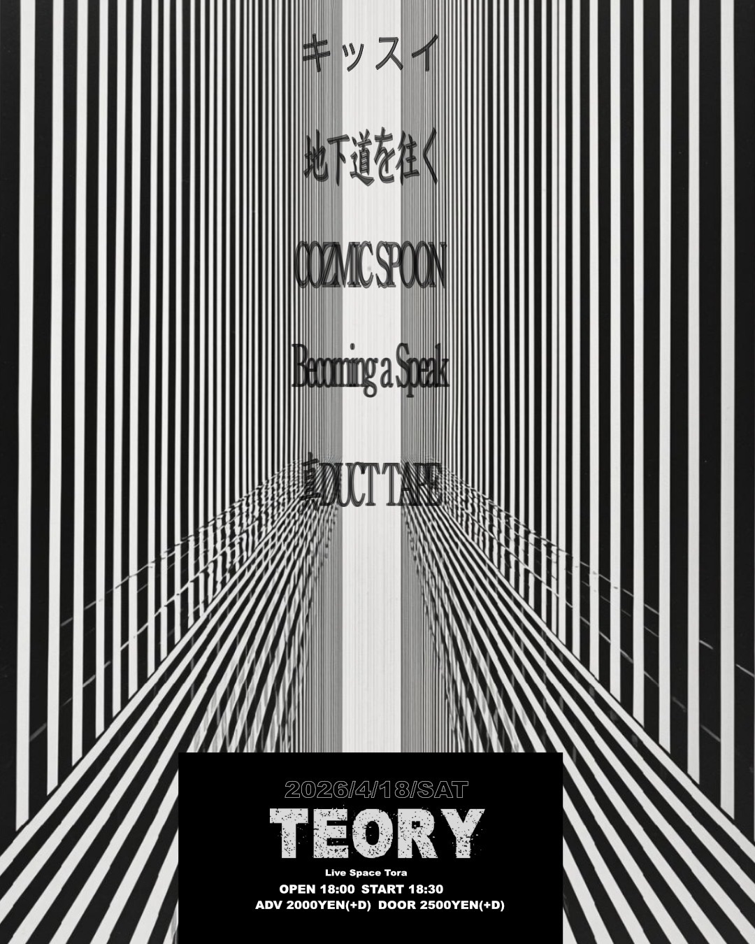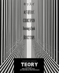 2026 4/18sat[TEORY] 2026.04.18 act… キッスイ 地下道を往く COZMIC SPOON 真DUCT TAPE(名古屋) Becoming a Speck(岡山) OPEN 18:00 START 18:30 Adv.¥2000(+1D) Door.¥2500(+1D)
