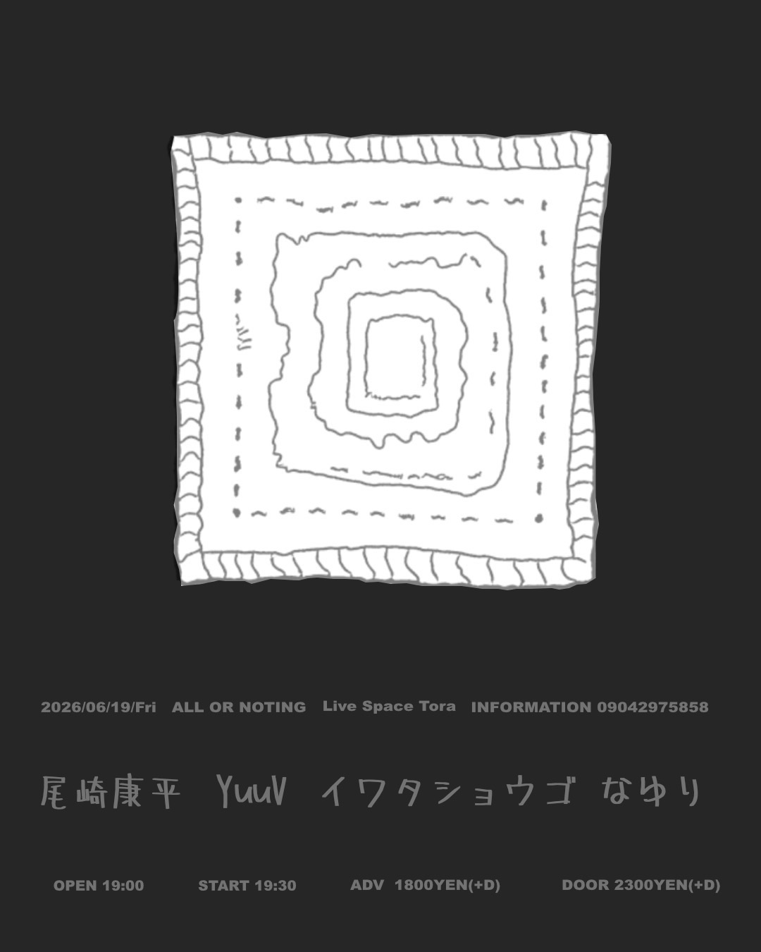 2026 6/19fri[ALL OR NOTHING] 2026.06.19 act… 尾崎康平 YuuV イワタショウゴ なゆり and more… OPEN 19:00 START 19:30 Adv.¥1800(+1D) Door.¥2300(+1D)