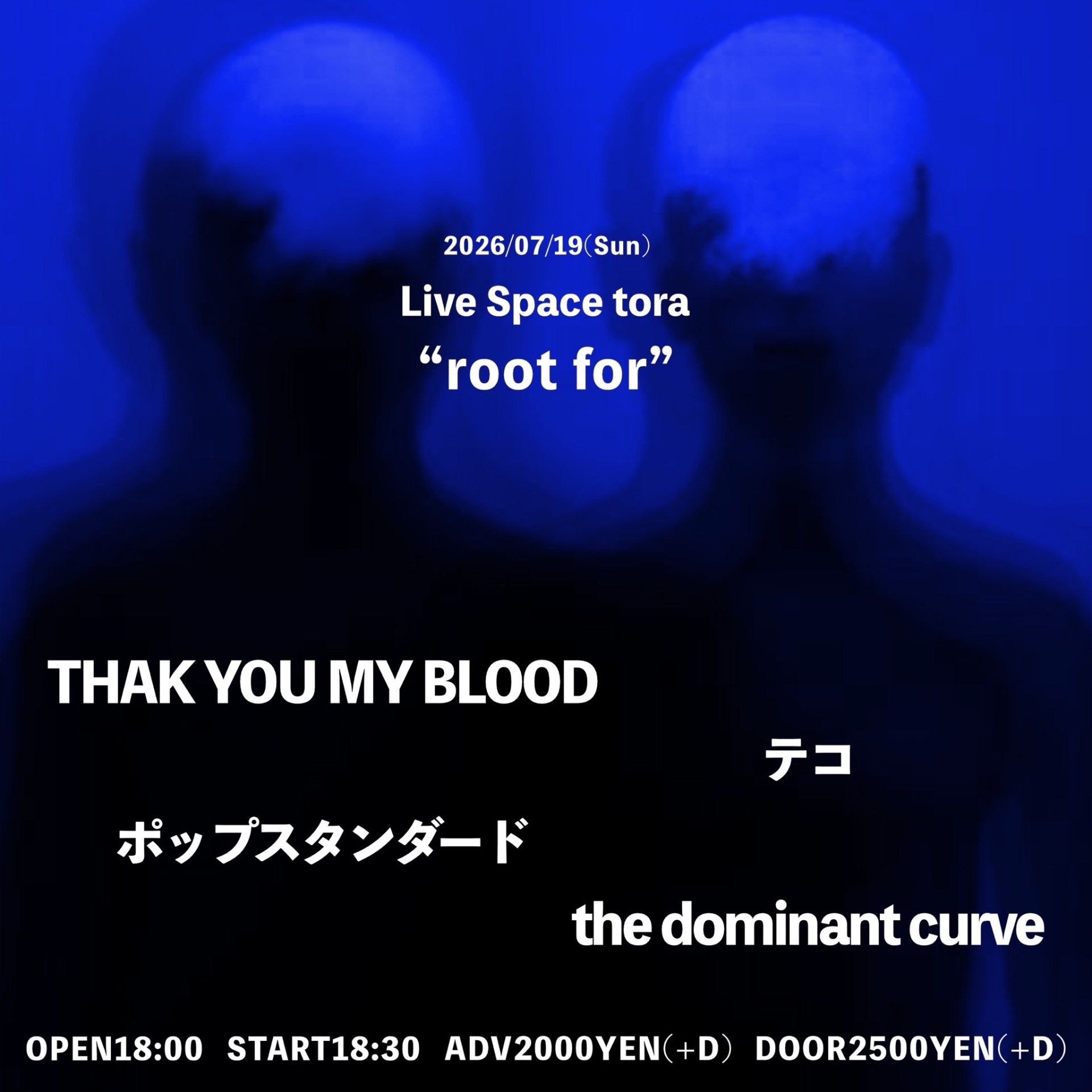 2026 7/19sun[root for] 2026.07.11 act… THANK YOU MY BLOOD テコ ポップスタンダード the dominant curve and more … OPEN 18:00 START 18:30 Adv.¥2000(+1D) Door.¥2500(+1D)