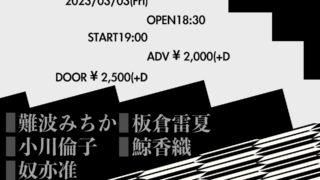 2023.03 2023 3/3fri[鍵まつり] act...難波みちか板倉雷夏小川倫子鯨香織奴亦准OPEN 18:30START 19:00Adv.¥2000(+1D)Door.¥2500(+1D) 2023.03