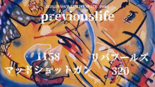 2024.09 2024 9/4wed[previous life] act...1158リバプールズマッドショットガン320OPEN 18:30START 19:00Adv.¥1800(+1D)Door.¥2300(+1D) 2024.09