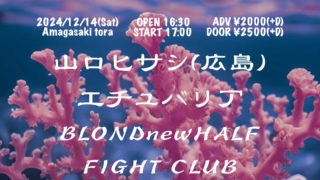 act...山口ヒサシ(広島)エチュバリアBLONDnewHALFFIGHT CLUBハウリングセッタ(佐世保)雨面ナラカシウサギバニーボーイ(広島)OPEN 16:30START 17:00Adv.¥2000(+1D)Door.¥2500...